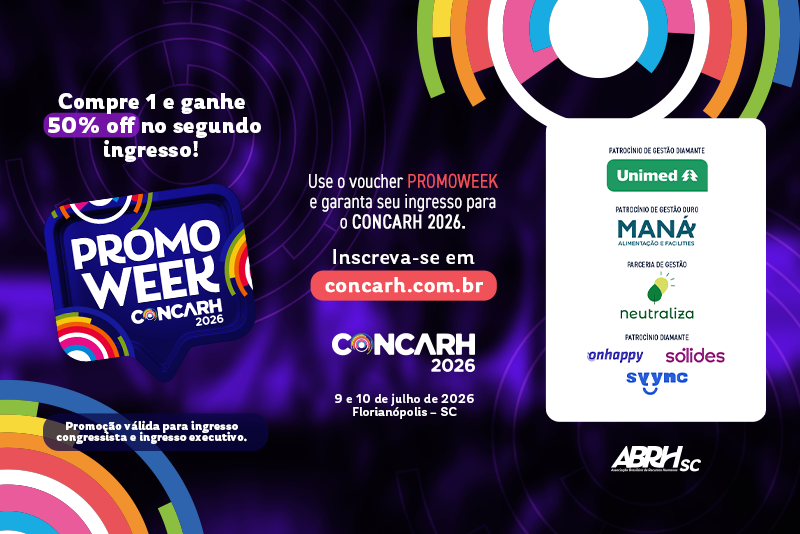 A ABRH-SC lançou hoje a PROMOWEEK do CONCARH 2026, uma das condições mais especiais do ano para quem deseja garantir presença no maior congresso de gestão de pessoas do Sul do Brasil. A campanha estará ativa de 19 a 30 de novembro e oferece um benefício exclusivo: na compra de um ingresso, o segundo sai com 50% de desconto, utilizando o cupom PROMOWEEK.