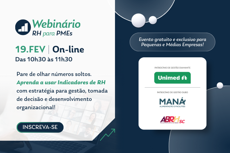 Lançamos a primeira edição do Webinário RH para PMEs, uma iniciativa criada para apoiar pequenas e médias empresas no fortalecimento da Gestão de Pessoas. O tema de estreia é “Indicadores de RH para Pequenas e Médias Empresas”, com foco em apresentar métricas essenciais e aplicações práticas para a tomada de decisão baseada em dados.